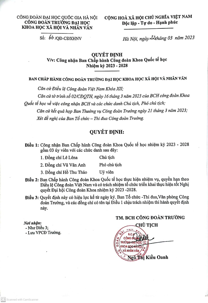 Công đoàn trường ĐHKHXH&NV ra quyết định số 60/QĐ-CĐXHNV ngày 22/3/2023 về việc công nhận BCH Công đoàn Khoa Quốc tế học.